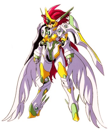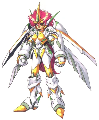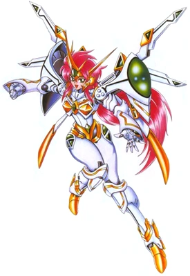 The Valsione is a machine built and developed by the Divine Crusaders, under the leadership of Dr. Bian Zoldark. It was specifically designed for his daughter, Lune Zoldark, who was trained to become a pilot at a young age. It may be considered the female counterpart of the much more powerful Valsion, the personal machine to Bian himself (and the most powerful mecha of the Divine Crusaders, excluding the Granzon). According to Lune, she disliked the Valsion's design, so Bian created the Valsione from scratch, using his daughter's appearance as the basis of the machine. Both the Valsione and the Valsion share the same basic technology and weaponry. While less powerful than the Valsion, the Valsione is still quite a versatile robot compared to the usual standards. The Valsione is flight-capable, due to a miniature modified Tesla Drive. This allows it great mobility and speed -- in addition, it is able to make short bursts of speed, giving it an ability to create an "after-image" effect, to confuse enemies. However, this ability comes directly from Lune herself, and not from any piece of equipment on the Valsione. The control system used was the DML (Direct Motion Link) System which was later installed for the DGG series. A special ABMD (Artifical Bone & Muscular tissue Drive) System was also used in unison with the DML System to allow the Valsione to sport human-like facial expressions using AM (Artificial Muscle) Sheaves by mimicking the muscle movements of Lune.